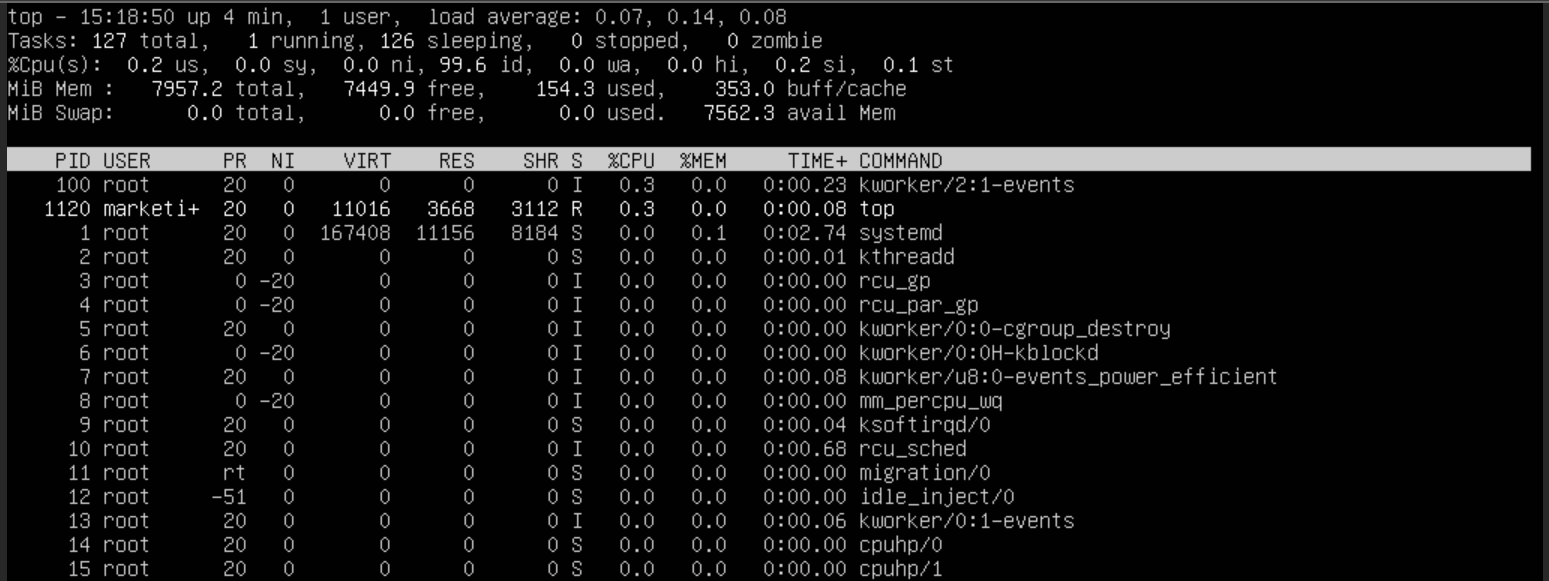 โtopโ merupakan command yang sering digunakan untuk memonitor statistik sistem. Statistik tersebut akan ditampilkan secara real-time tentang penggunaan sistem, seperti penggunaan CPU, RAM, dan proses yang sedang berjalan.
