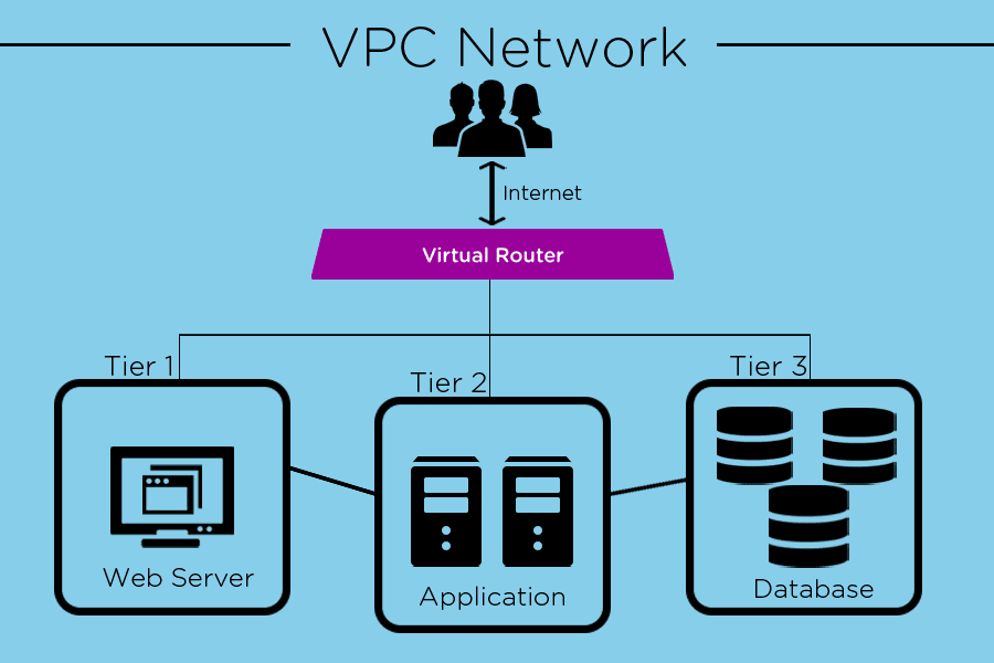 Konsep dasar VPC network adalah tiering network jadi setiap layanan bisa memiliki jaringan virtual yang berbeda namun terhubung ke internet dengan satu jaringan dan satu IP yang sama. Tiering network akan lebih mudah dipahami dengan gambar dibawah ini.ย