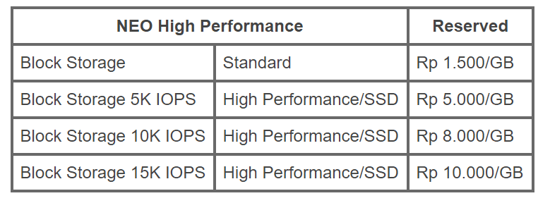 Demi mengetahui kebutuhan IOPS secara terperinci, Anda perlu memahami spesifikasi disk tertentu, menguraikan beban kerja (workload), dan beberapa hal lainnya sesuai kebutuhan. NEO High Performance juga dirancang mampu memberikan latensi yang sangat kecil dan menawarkan performa read/write yang jauh lebih cepat sehingga bisa mengakomodasi workload yang sangat tinggi karena tingkat ketersediaannya pun secara signifikan meningkat.