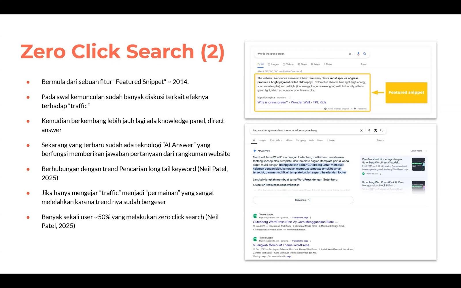 Hal ini terjadi karena Google dan mesin pencari lainnya kini lebih banyak menampilkan informasi langsung di halaman hasil pencarian (SERP), melalui fitur seperti featured snippet, people also ask, dan AI overview. Alhasil, user tidak lagi perlu mengklik website untuk mendapatkan jawaban. Fenomena ini dikenal sebagai zero-click search.