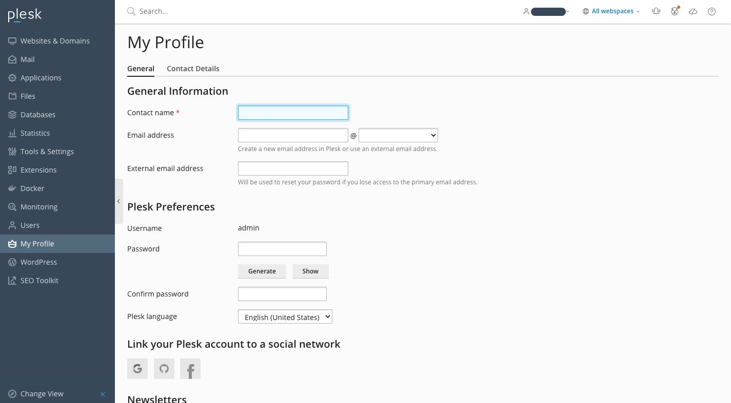 - General: Untuk mengelola informasi kontak dan akses Plesk.ย