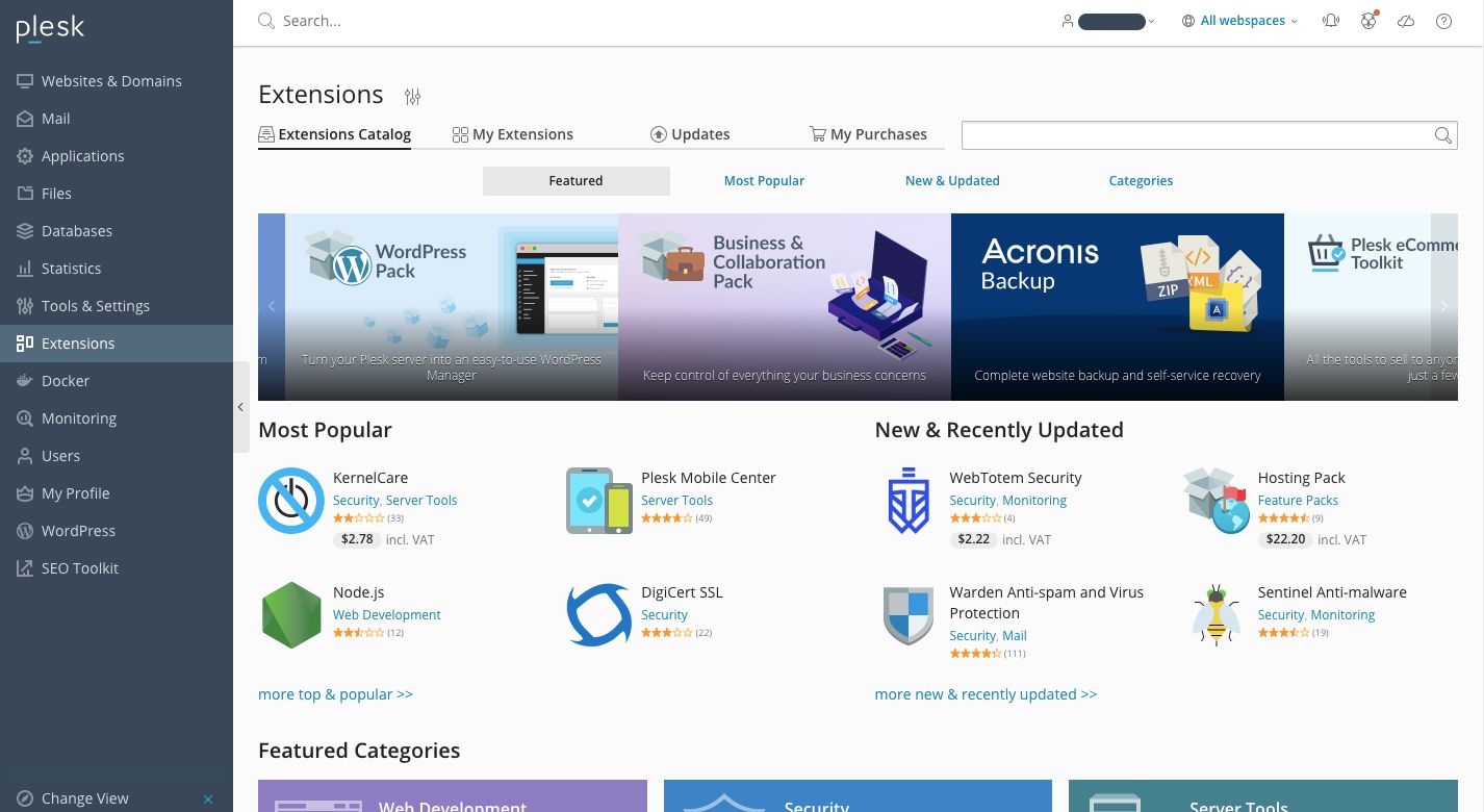 Plesk juga memiliki berbagai pilihan extentions atau ekstensi yang lengkap untuk memenuhi kebutuhan hosting, seperti Laravel Toolkit, Kaspersky Anti-Virus License, .NET Toolkit, ImunifyAV, Plesk eCommerce Toolkit, Acronis Backup, dan lain sebagainya.ย